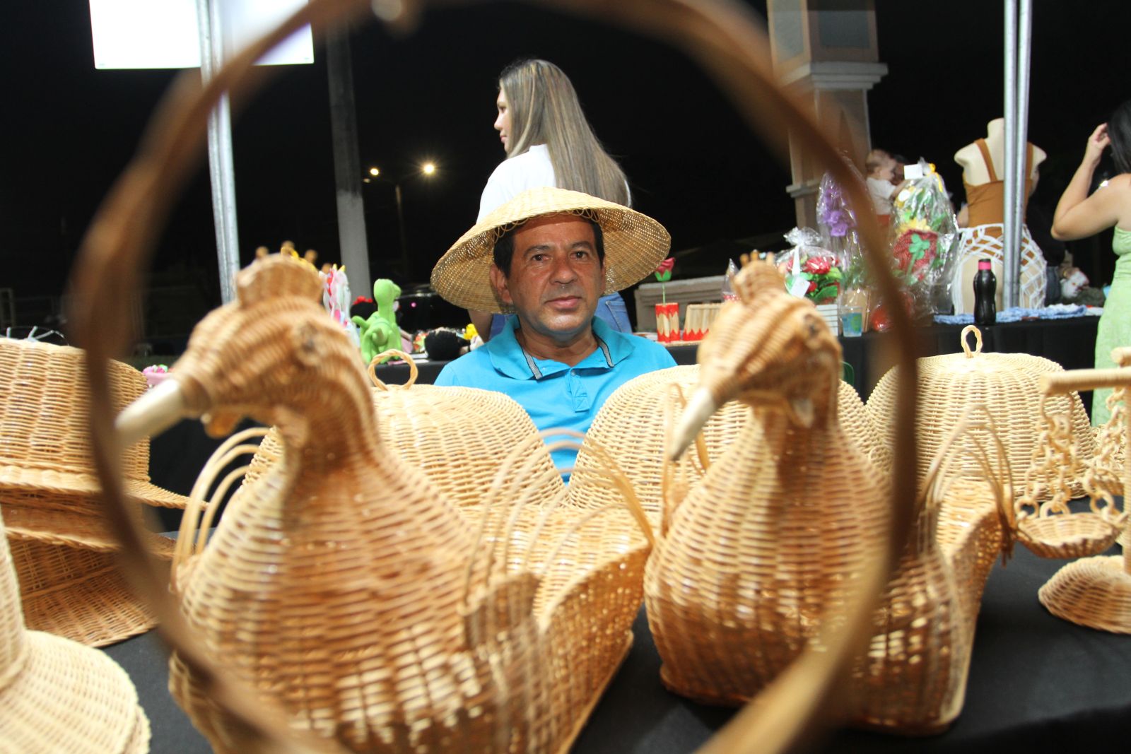 Cícero do Terço, como é conhecido, mostra seu trabalho com raiz de cipós na feira de artesanato da Assembleia Itinerante - Foto Júnior Pio