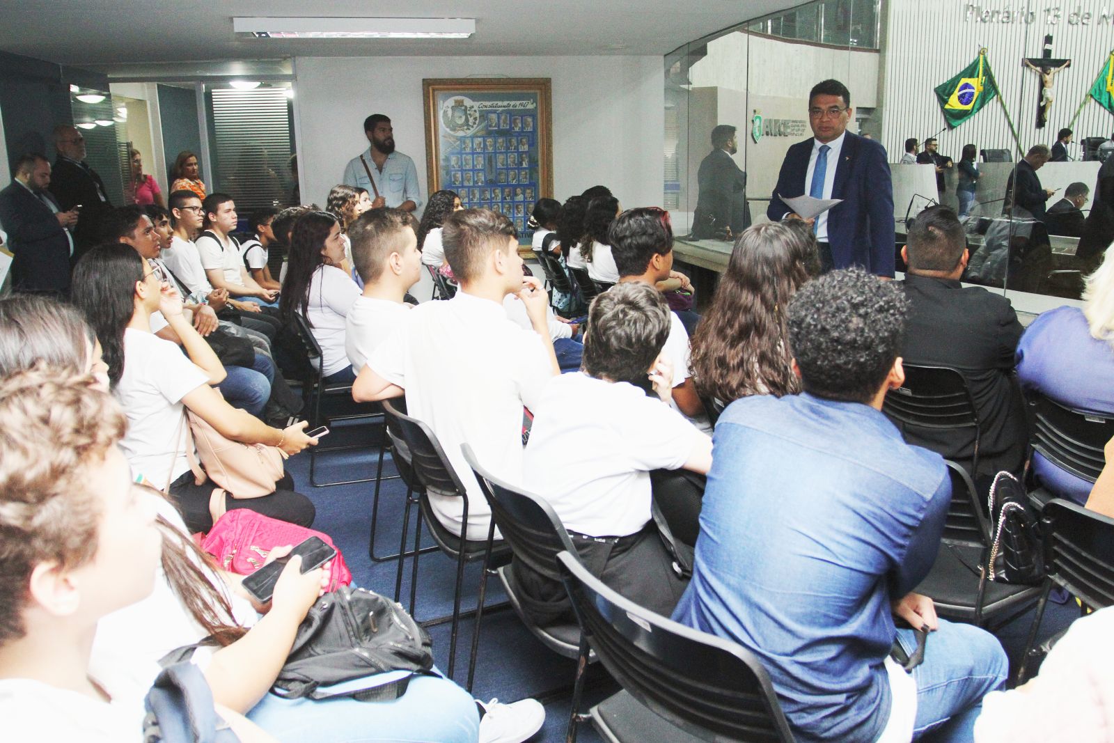 O deputado Sargento Reginauro (União) - que recebeu os estudantes e os professores no Plenário 13 de Maio – destacou a importância do Parlamento para a vida em sociedade, sobretudo na decisão de assuntos que interferem e que regem a vida em comunidade. Ele enfatizou também a necessidade de todos, principalmente os jovens, acompanharem o que acontece nas casas legislativas e Executivos. “Acompanhem e cobrem. Aqui fomos eleitos por vocês e é necessário que esse acompanhamento seja feito para garantir os interesses da população”, disse.