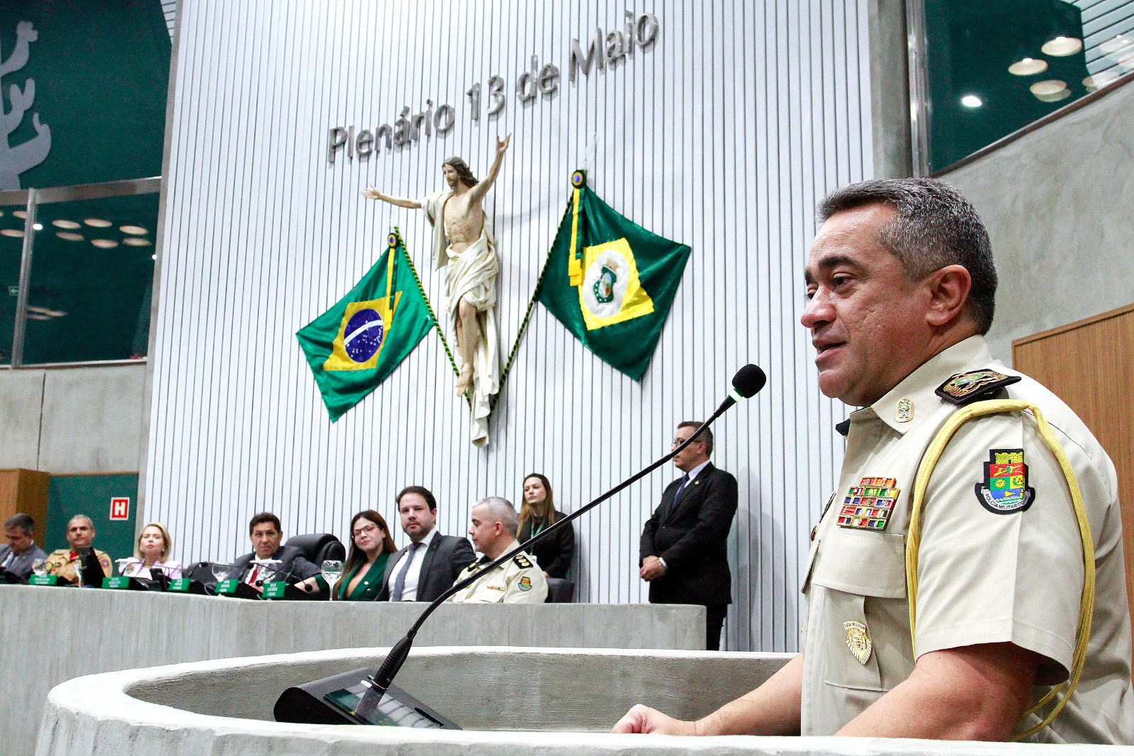 Além dos citados, participaram da mesa da sessão solene a deputada estadual Juliana Lucena (PT); a delegada-geral adjunta da Polícia Civil do Estado do Ceará (PC-CE), Teresa Cruz; o tenente-coronel PM Alexandre Torres; o assessor especial de Relações Comunitárias do Governo do Estado, André Barbosa, e o comandante-geral do Corpo de Bombeiros do Ceará, coronel Cláudio Barreto.