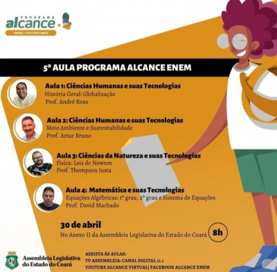 O projeto Alcance.Enem, da Assembleia Legislativa do Ceará, transmite, neste sábado (05/03), pela TV Assembleia (canal 31.1), das 8h às 12h30, a...