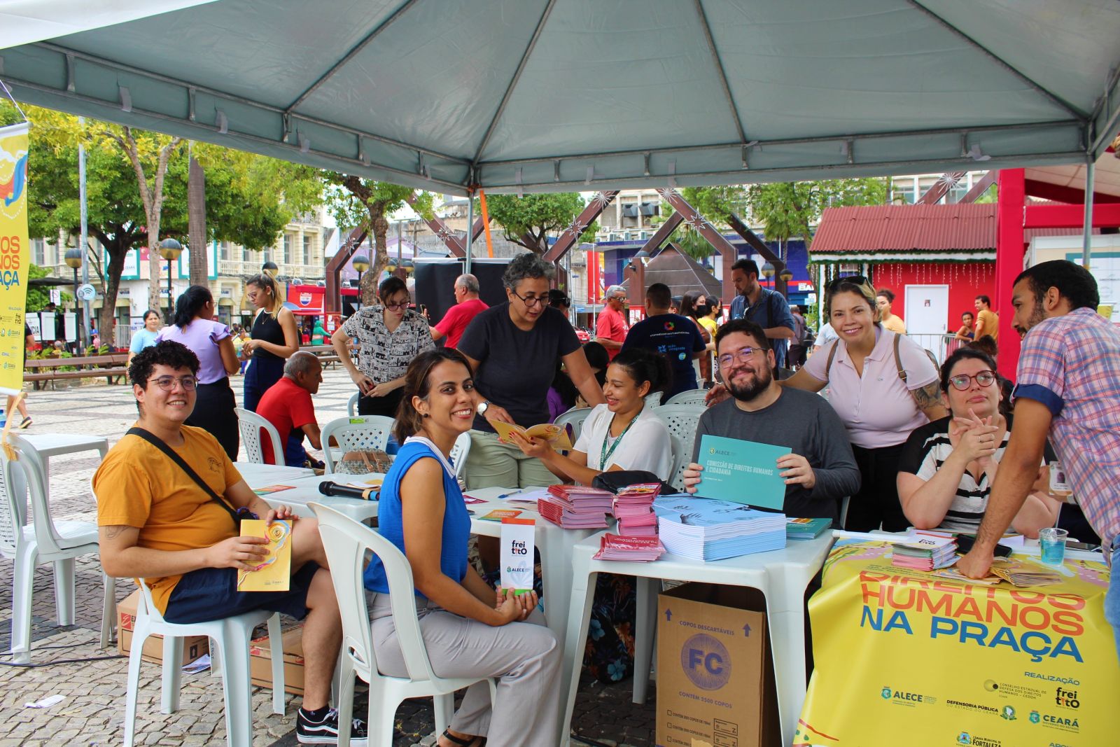 A Praça do Ferreira, no Centro de Fortaleza, foi palco, na manhã deste sábado (09/12), da ação Direitos Humanos na Praça, direcionada para a oferta gratuita de serviços em direitos humanos à população. A iniciativa foi promovida pela Assembleia Legislativa do Ceará (Alece), por meio da Comissão de Direitos Humanos e Cidadania (CDHC) e Escritório Frei Tito de Alencar (EFTA), em parceria com a Defensoria Pública do Estado do Ceará, Secretaria Estadual de Direitos Humanos, Conselho Estadual de Direitos Humanos e Câmara Municipal de Fortaleza.