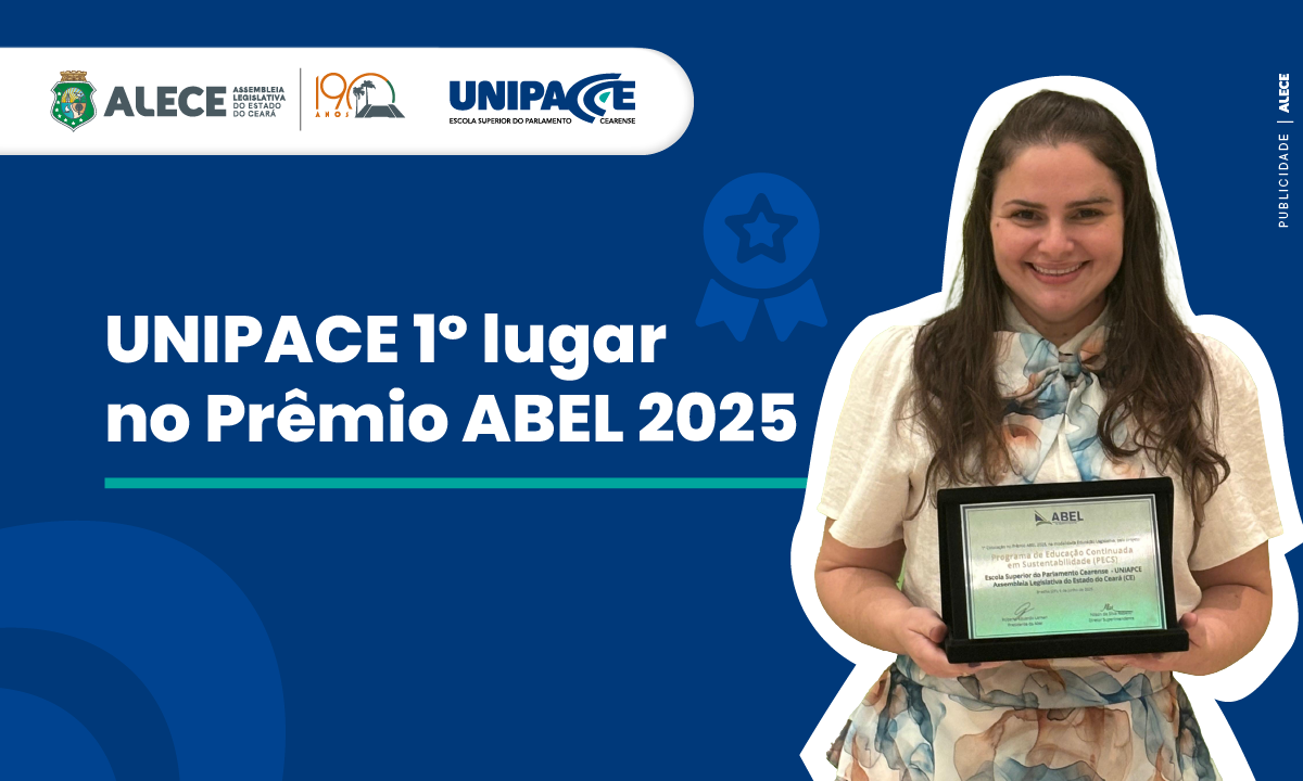 A Escola Superior do Parlamento Cearense (Unipace), da Assembleia Legislativa do Estado do Ceará (Alece), comemora o 1º lugar na categoria Educação Legislativa do Prêmio ABEL 2025, promovido pela Associação Brasileira das Escolas do Legislativo e de Contas (ABEL). A premiação foi anunciada nesta sexta-feira (06/06), durante o 41º Encontro Nacional da ABEL, realizado de 4 a 6 de junho, em Natal (RN).