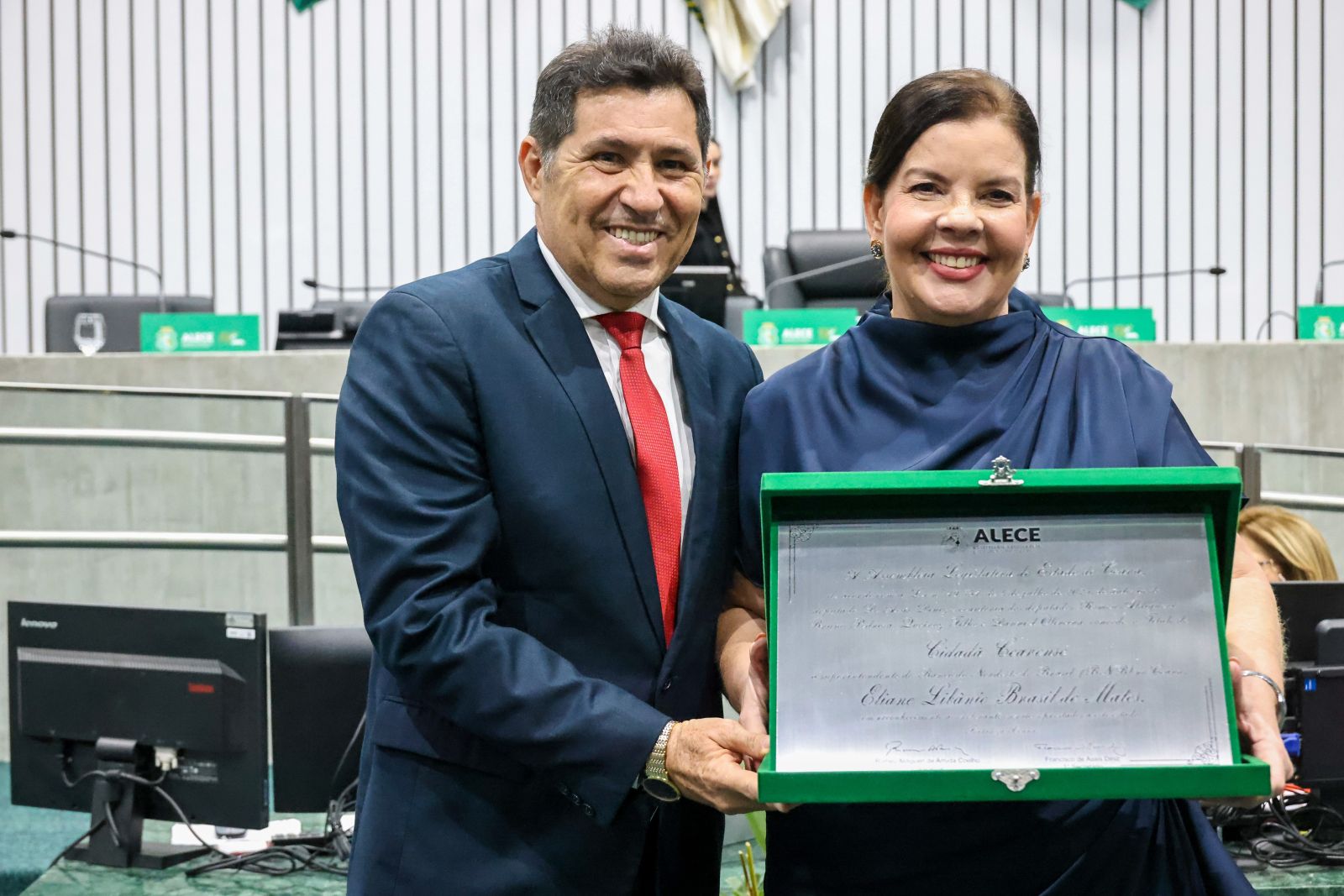 A Assembleia Legislativa do Estado do Ceará (Alece) promoveu, na tarde desta quinta-feira (02/10), solenidade para a entrega do Título de Cidadã Cearense à superintendente do Banco do Nordeste do Brasil (BNB) no Ceará, Eliane Libânio Brasil de Matos. A honraria foi concedida por meio da Lei Estadual de n.º 19.351/2025, fruto de projeto apresentado pelo deputado De Assis Diniz (PT), com subscrição dos deputados Romeu Aldigueri (PSB), Danniel Oliveira (MDB), Bruno Pedrosa (PT) e Queiroz Filho (PDT).
