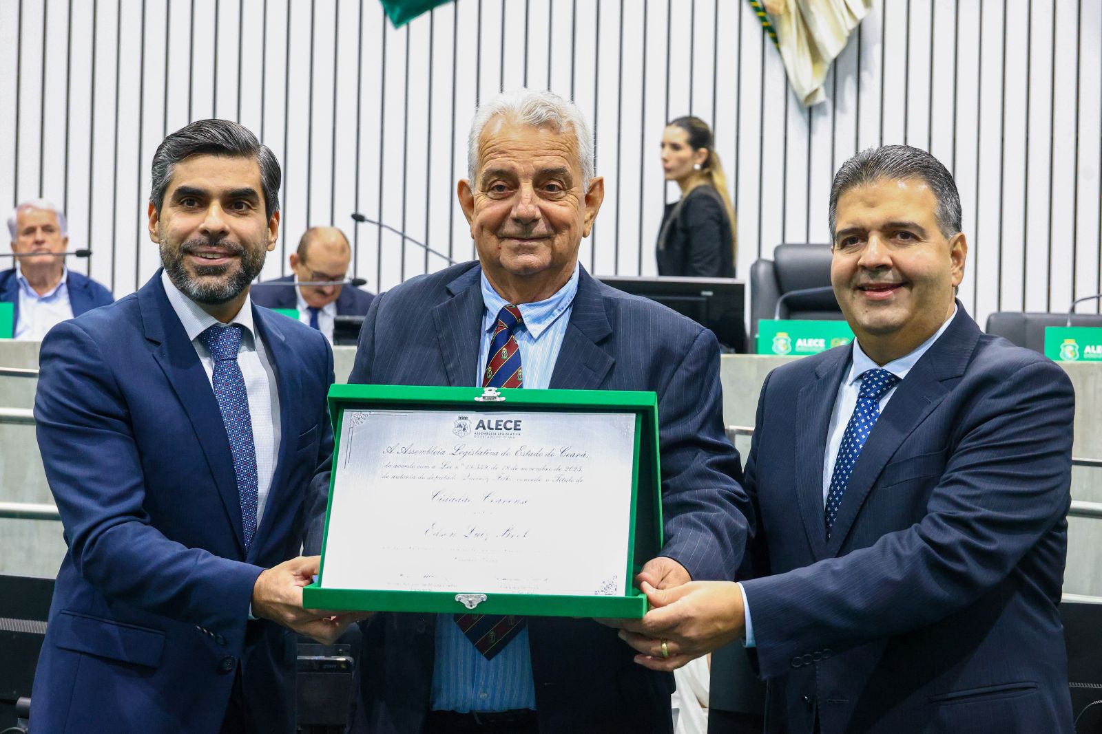 A Assembleia Legislativa do Estado do Ceará (Alece) promoveu, na tarde desta terça-feira (25/11), solenidade para entrega do Título de Cidadão Cearense ao empresário dos setores de logística e fruticultura Edson Luiz Brok, nascido em São Paulo. A honraria foi concedida por meio da Lei Estadual de n.º 19.549/2025, fruto de projeto apresentado pelo deputado Queiroz Filho (PDT), solicitante da cerimônia de hoje.