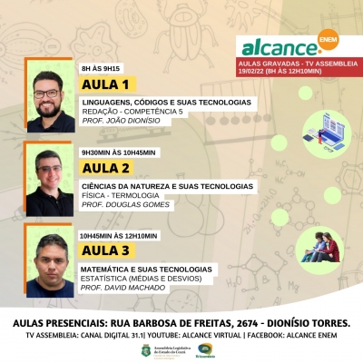 O Projeto Alcance.Enem, da Assembleia Legislativa do Ceará, reprisa, neste sábado (12/02), pela TV Assembleia (canal 31.1), das 8h às 12h10, as...