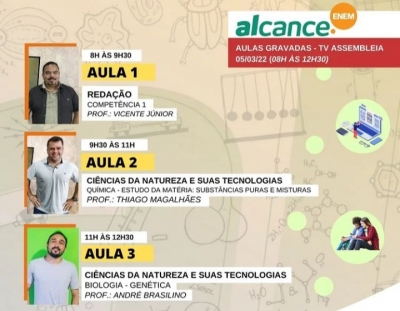 O projeto Alcance.Enem, da Assembleia Legislativa do Ceará, transmite, neste sábado (05/03), pela TV Assembleia (canal 31.1), das 8h às 12h30, a...