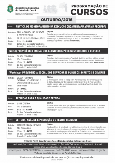 A Divisão de Treinamento da Assembleia Legislativa do Ceará está com inscrições abertas para três cursos de capacitação para servidores que...